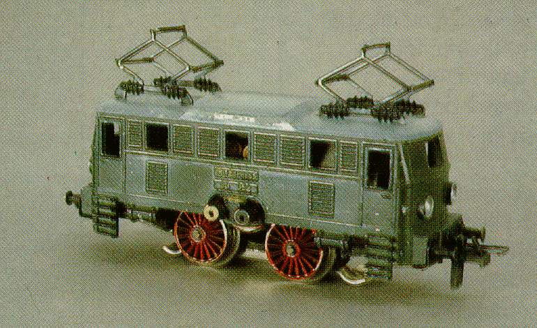 | Gehäuse und die vier Druckzylinder grün, Dach: dunkelgrau. Zwei eingesteckte Pantographen aus gestanztem Stahlblech ohne Funktion. Fenster ohne Rahmen, Gehäuseunterkante, Pufferbohle, Treppen und verstärktes Fahrgestell schwarz. Je zwei imitierte Stirnlampen. Die rot ausgelegten, nichtdurchbrochene Speichenräder sind auf die Achsen aufgesteckt und erhalten durch Isolierbuchsen die erforderliche Festigkeit.